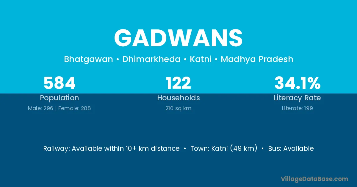 Katni (49 km) is the nearest town to Gadwans village for major economic activities and is located approximately 49 km away.