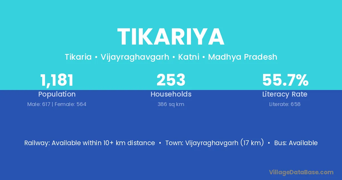Katni (15 km) is the nearest town to Tikariya village for major economic activities and is located approximately 15 km away.