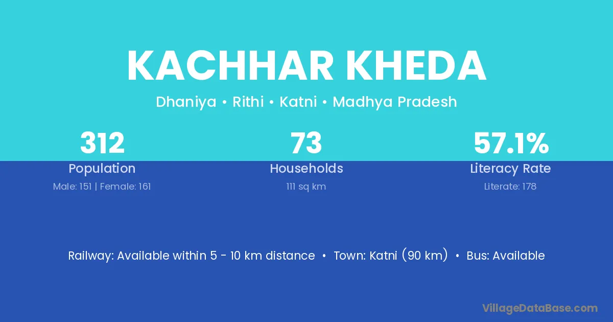 Katni (90 km) is the nearest town to Kachhar Kheda village for major economic activities and is located approximately 90 km away.