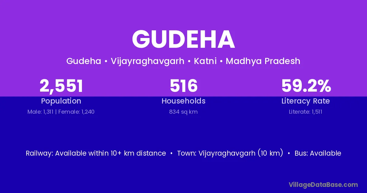 Vijayraghavgarh (10 km) is the nearest town to Gudeha village for major economic activities and is located approximately 10 km away.