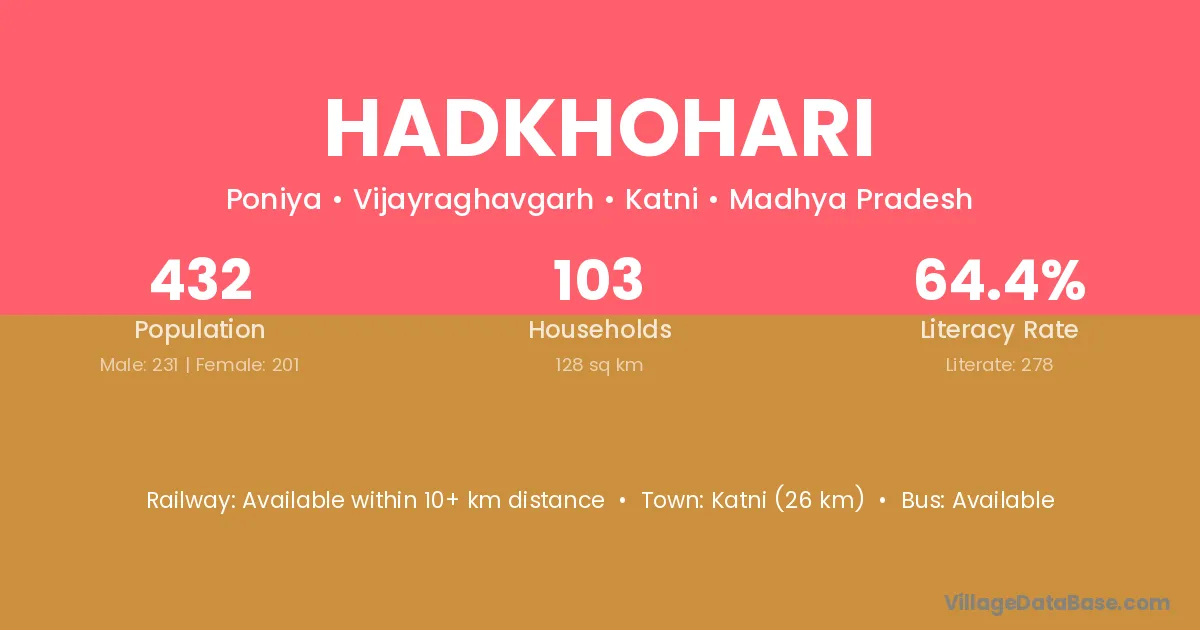Katni (26 km) is the nearest town to Hadkhohari village for major economic activities and is located approximately 26 km away.