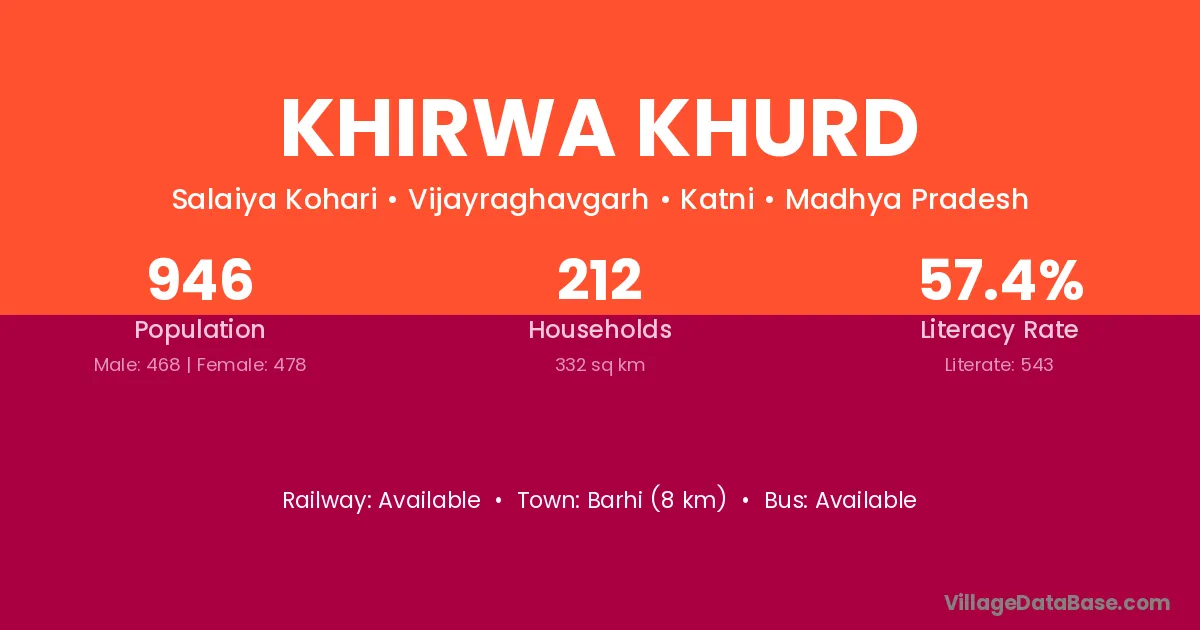 Khirwa Khurd village has a total population of 946 people, of which 468 are males and 478 are females.