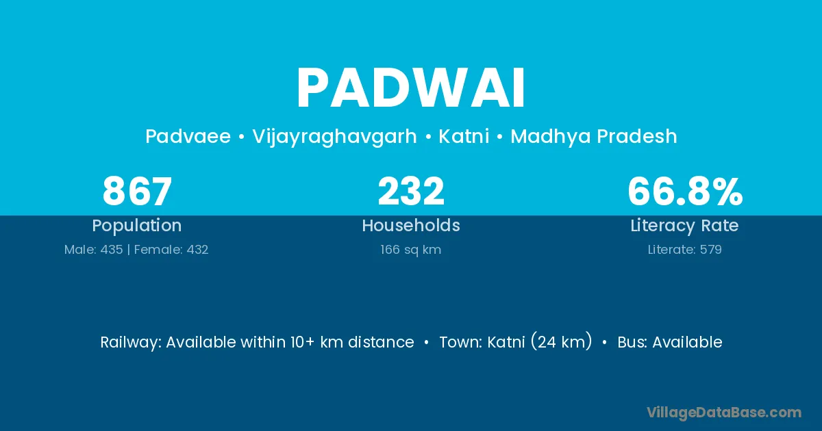 Katni (24 km) is the nearest town to Padwai village for major economic activities and is located approximately 24 km away.