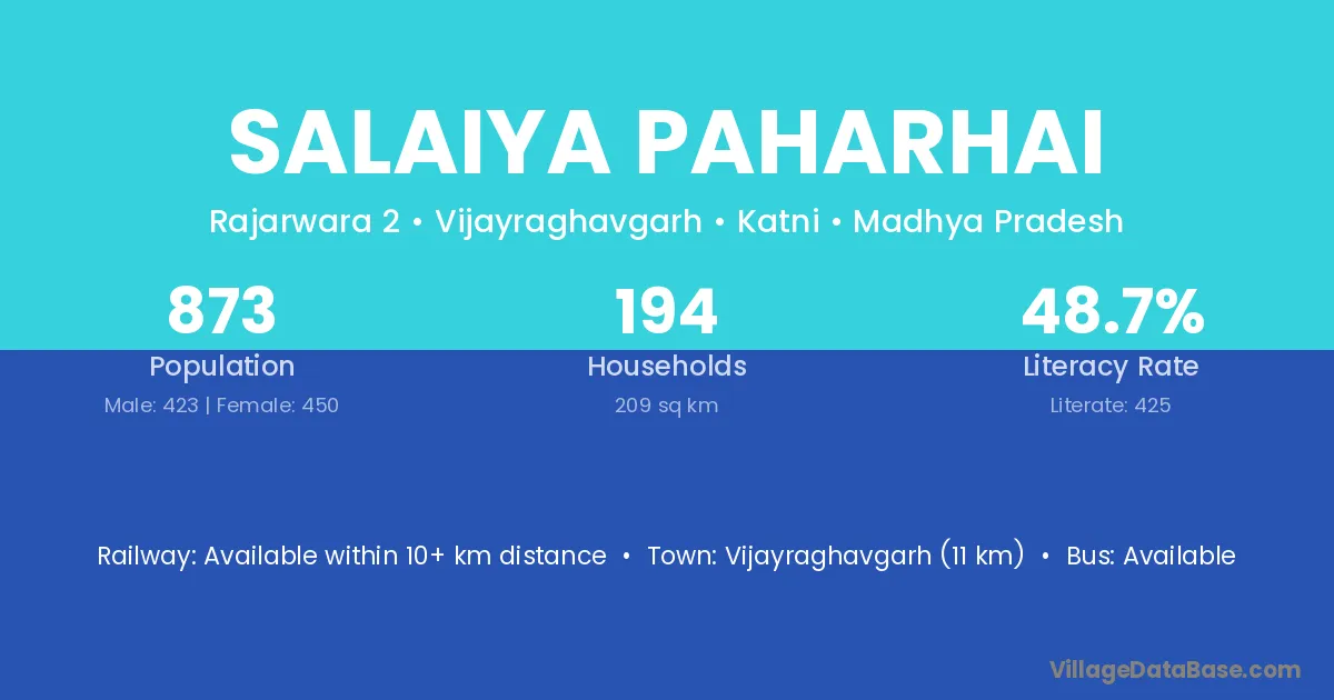 Vijayraghavgarh (11 km) is the nearest town to Salaiya Paharhai village for major economic activities and is located approximately 11 km away.