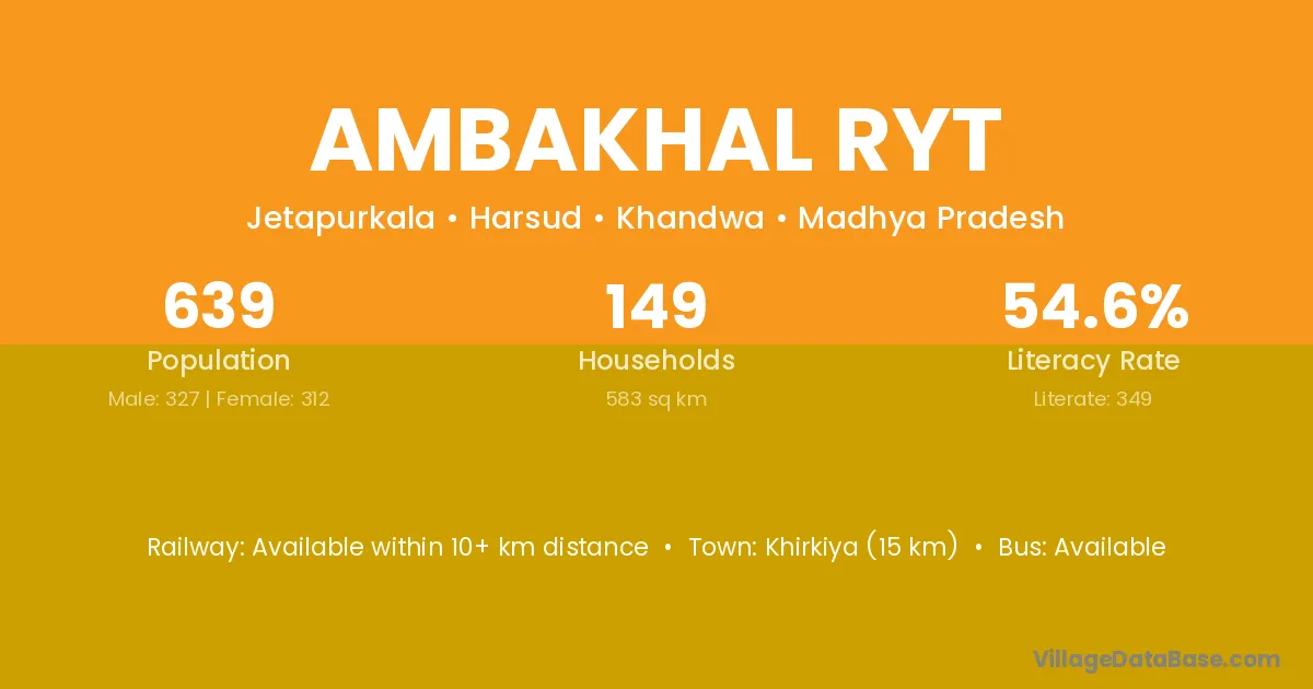 Khirkiya (15 km) is the nearest town to Ambakhal Ryt village for major economic activities and is located approximately 15 km away.