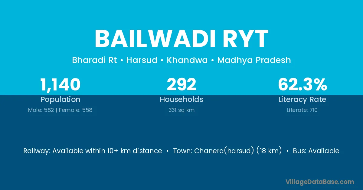 Chanera(harsud) (18 km) is the nearest town to Bailwadi Ryt village for major economic activities and is located approximately 18 km away.