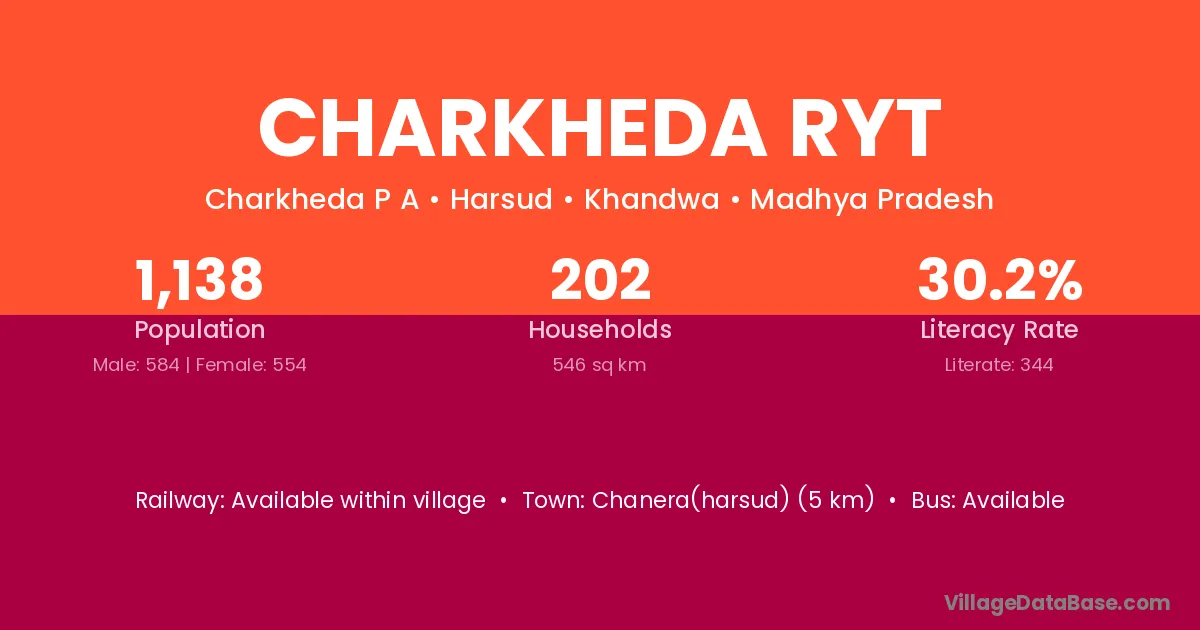 Charkheda Ryt village has a total population of 1,138 people, of which 584 are males and 554 are females.