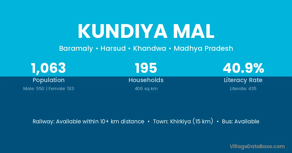Khirkiya (15 km) is the nearest town to Kundiya Mal village for major economic activities and is located approximately 15 km away.