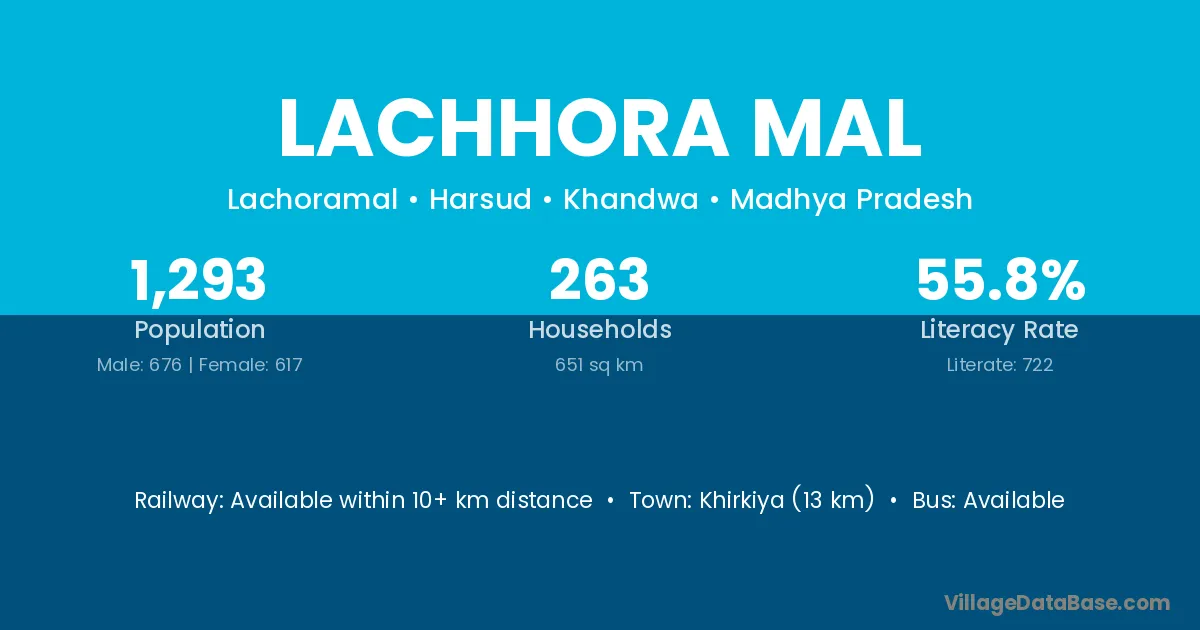 Khirkiya (13 km) is the nearest town to Lachhora Mal village for major economic activities and is located approximately 13 km away.