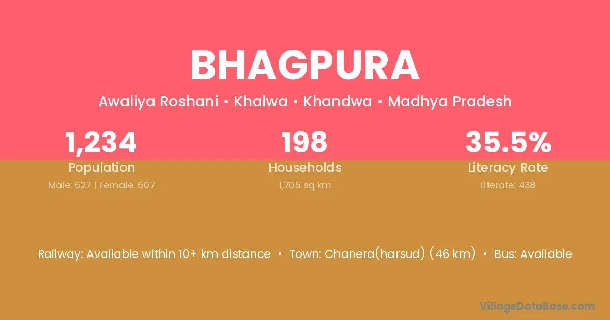 Chanera(harsud) (46 km) is the nearest town to Bhagpura village for major economic activities and is located approximately 46 km away.