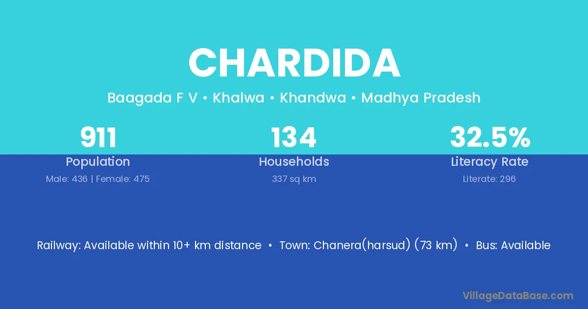 Chanera(harsud) (73 km) is the nearest town to Chardida village for major economic activities and is located approximately 73 km away.