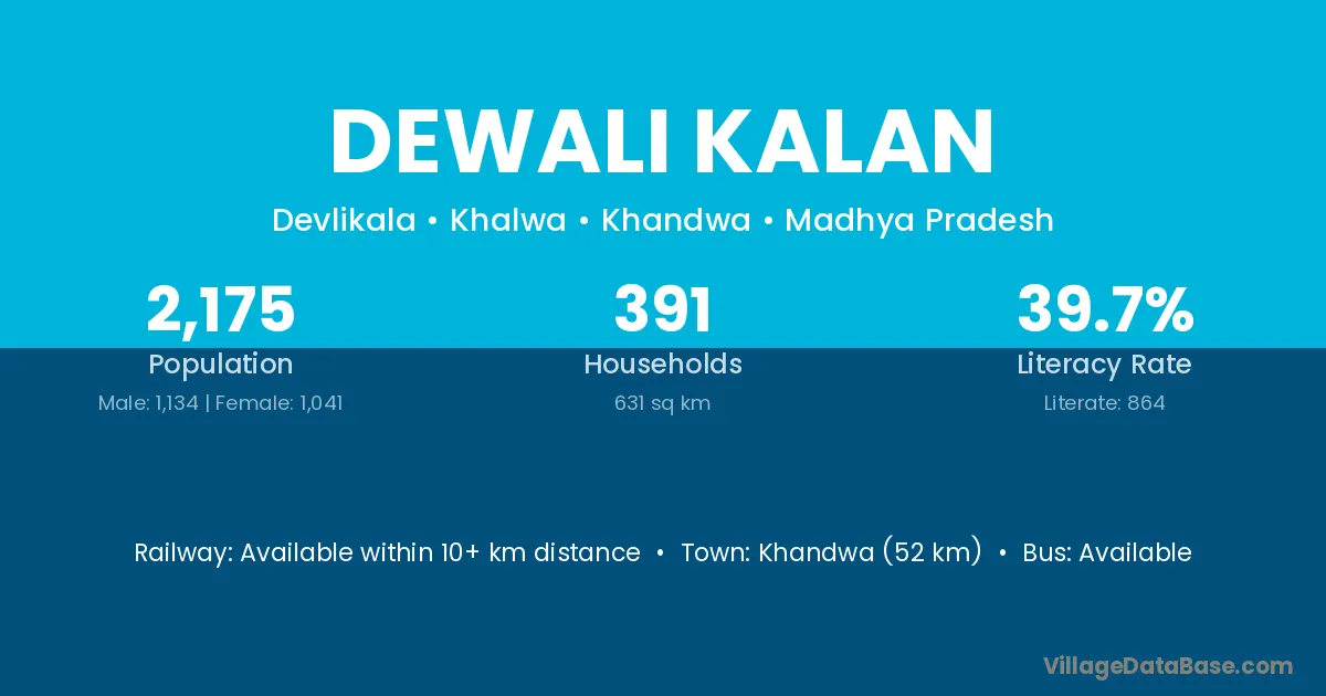 Khandwa (52 km) is the nearest town to Dewali Kalan village for major economic activities and is located approximately 52 km away.
