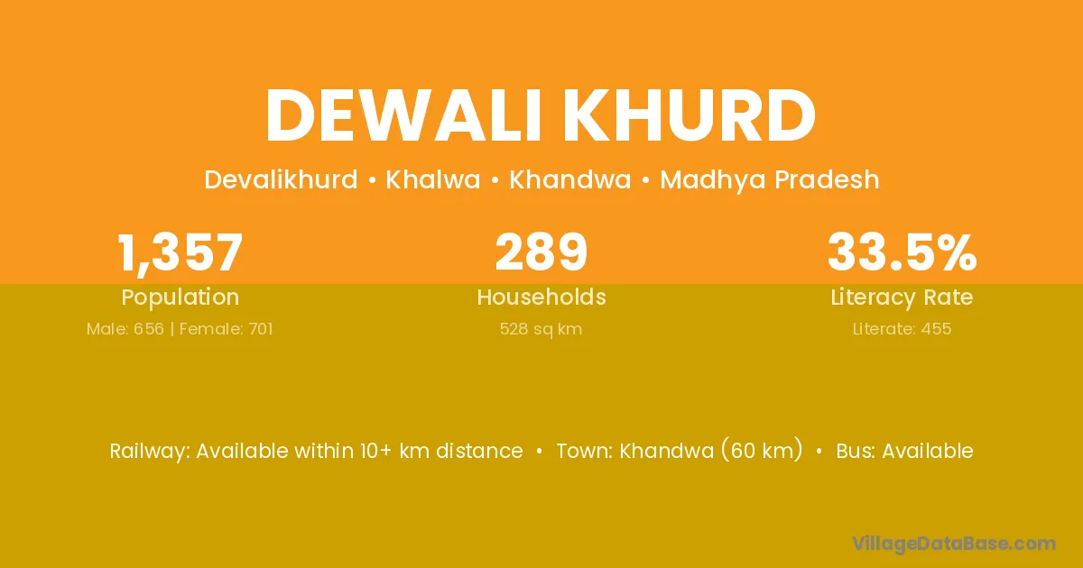 Khandwa (60 km) is the nearest town to Dewali Khurd village for major economic activities and is located approximately 60 km away.