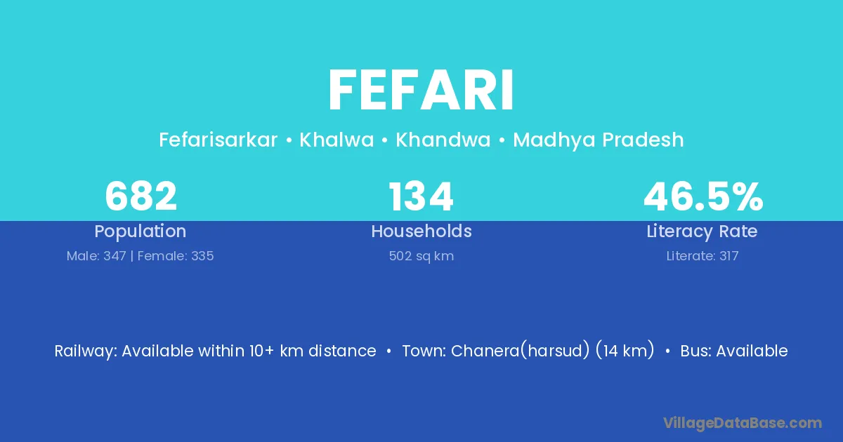 Chanera(harsud) (14 km) is the nearest town to Fefari village for major economic activities and is located approximately 14 km away.