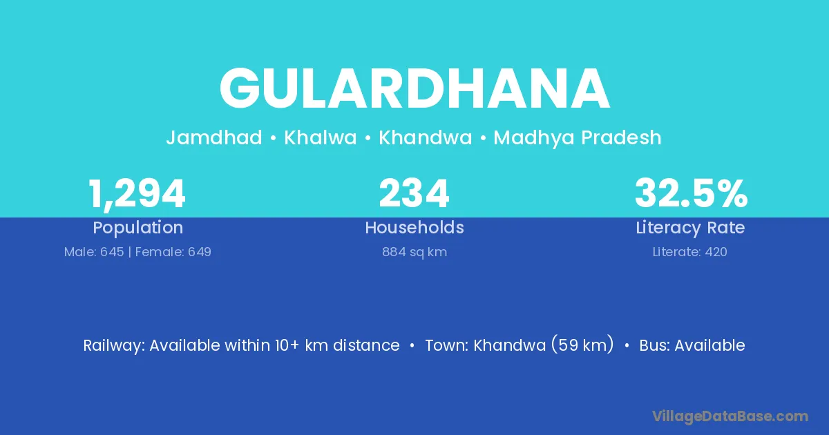 Khandwa (59 km) is the nearest town to Gulardhana village for major economic activities and is located approximately 59 km away.