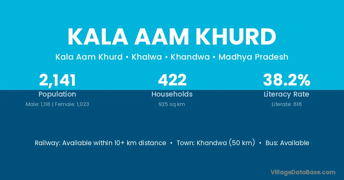 Khandwa (50 km) is the nearest town to Kala Aam Khurd village for major economic activities and is located approximately 50 km away.