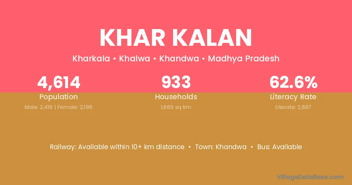 Khandwa is the nearest town to Khar Kalan village for major economic activities