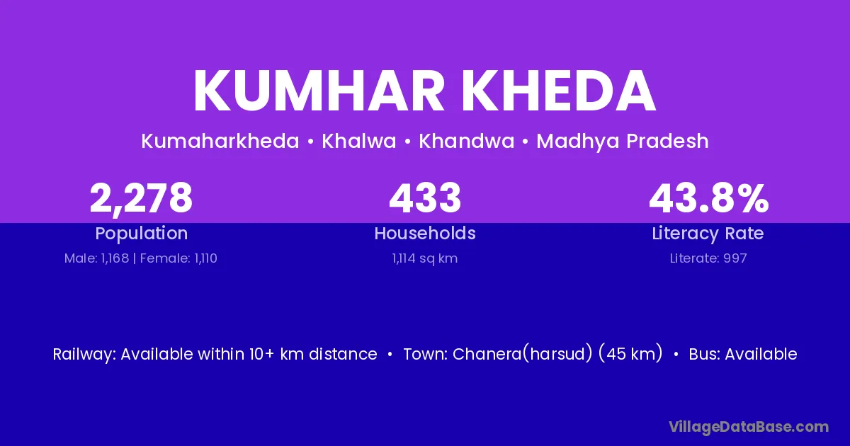 Chanera(harsud) (45 km) is the nearest town to Kumhar Kheda village for major economic activities and is located approximately 45 km away.