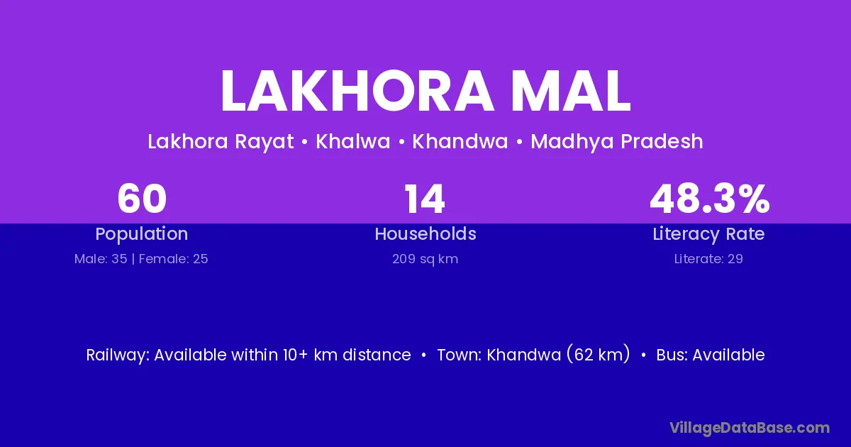 Khandwa (62 km) is the nearest town to Lakhora Mal village for major economic activities and is located approximately 62 km away.