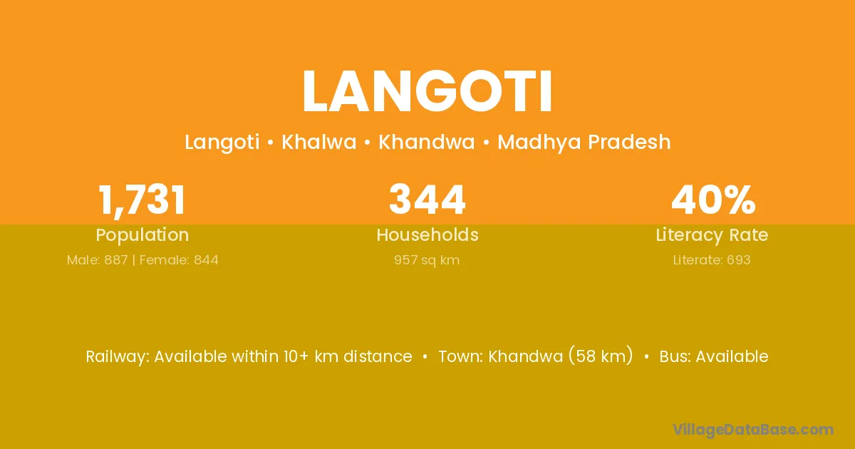 Khandwa (58 km) is the nearest town to Langoti village for major economic activities and is located approximately 58 km away.