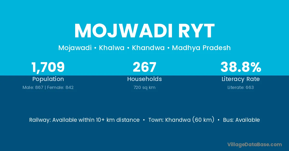 Khandwa (60 km) is the nearest town to Mojwadi Ryt village for major economic activities and is located approximately 60 km away.