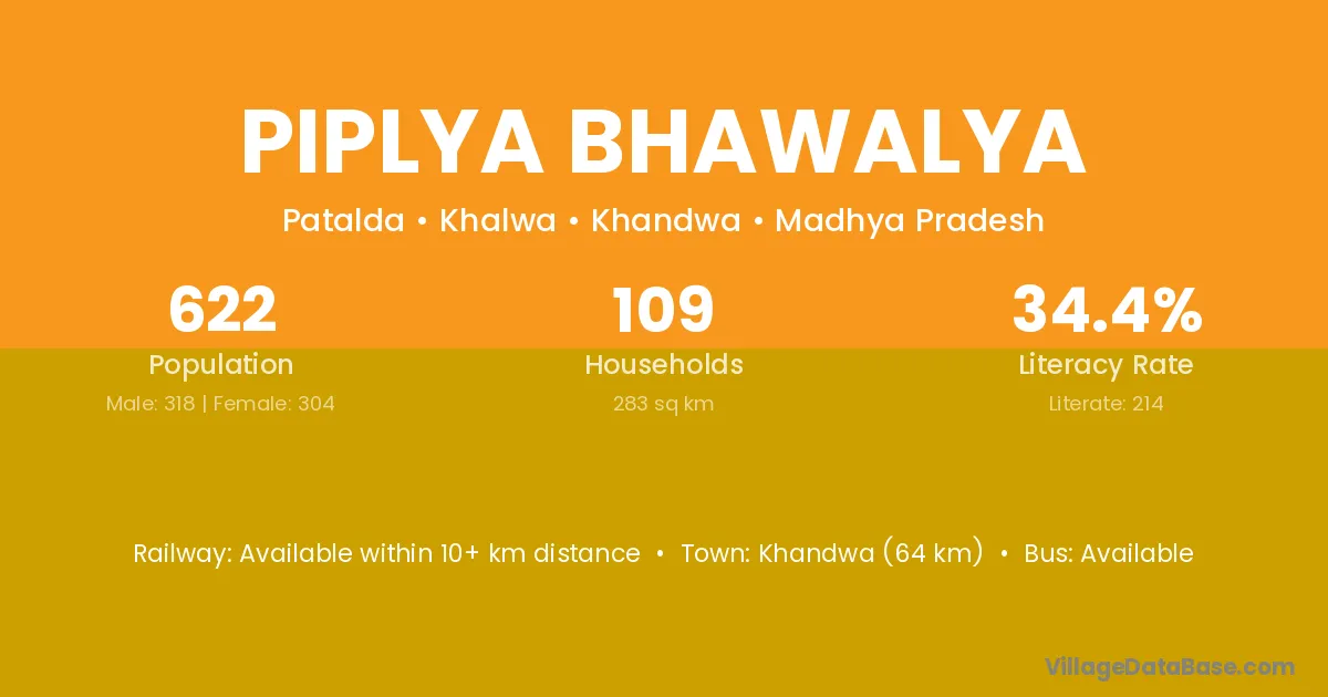 Khandwa (64 km) is the nearest town to Piplya Bhawalya village for major economic activities and is located approximately 64 km away.