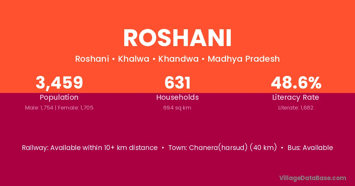 Chanera(harsud) (40 km) is the nearest town to Roshani village for major economic activities and is located approximately 40 km away.