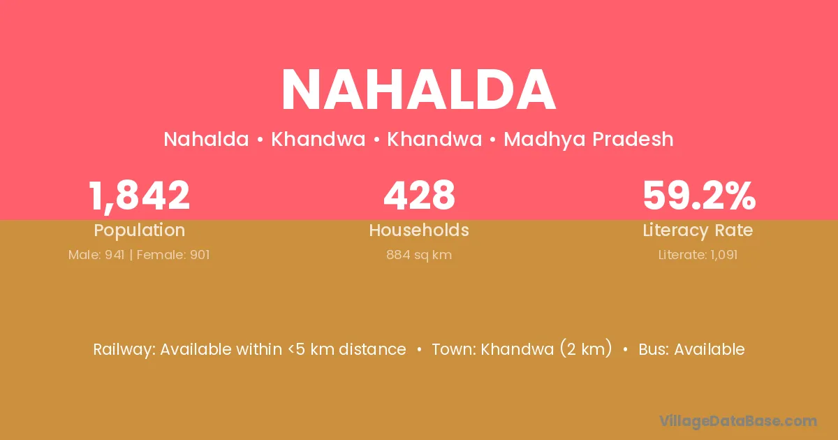 Khandwa (2 km) is the nearest town to Nahalda village for major economic activities and is located approximately 2 km away.