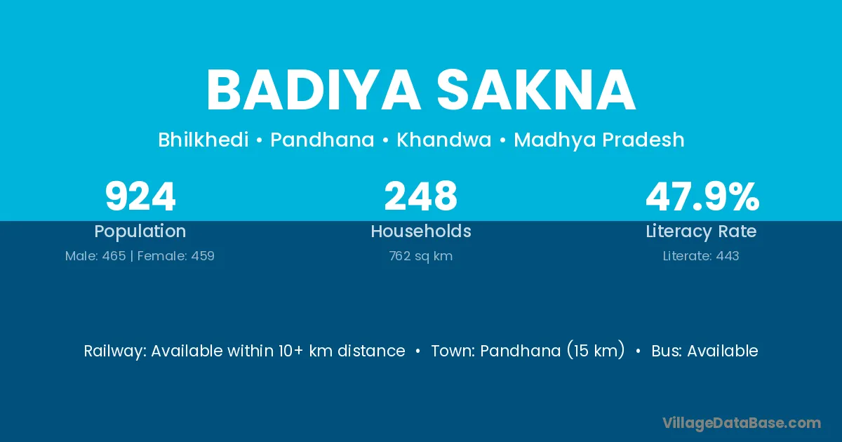 Pandhana (15 km) is the nearest town to Badiya Sakna village for major economic activities and is located approximately 15 km away.