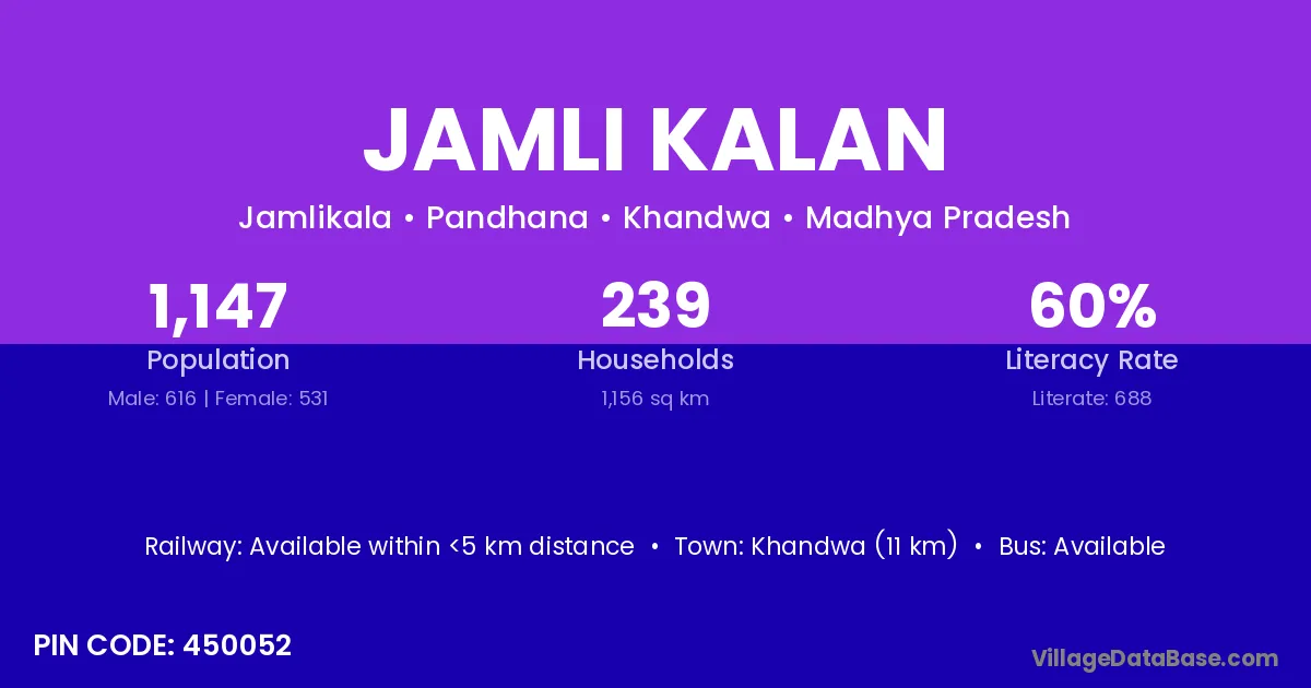 Khandwa (11 km) is the nearest town to Jamli Kalan village for major economic activities and is located approximately 11 km away.