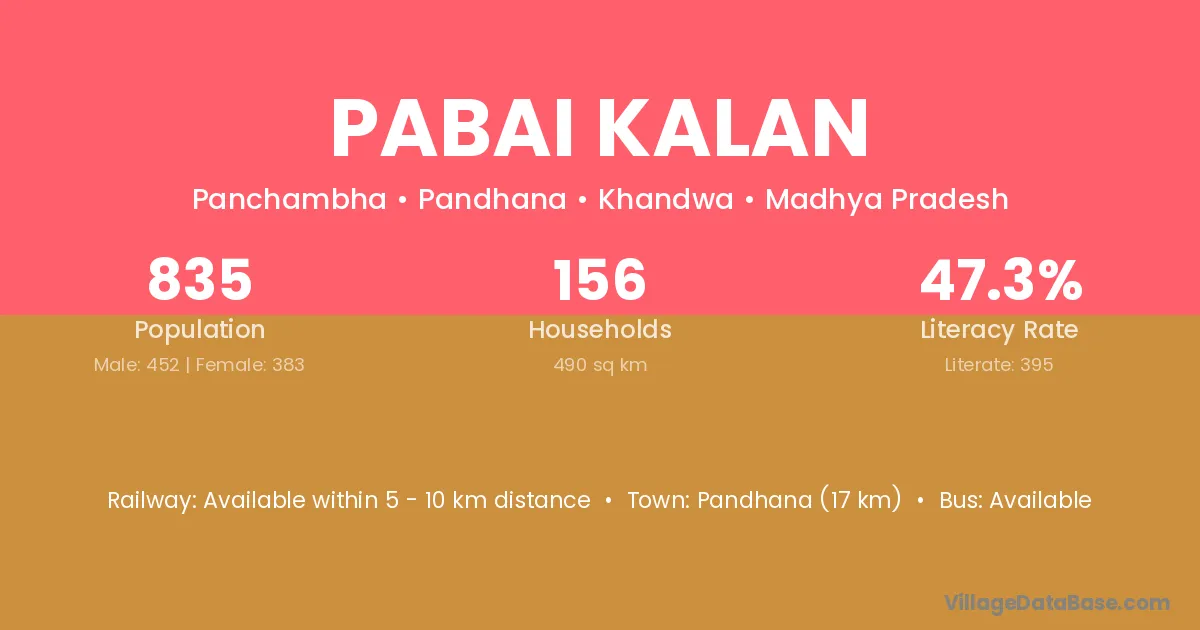 Pandhana (17 km) is the nearest town to Pabai Kalan village for major economic activities and is located approximately 17 km away.