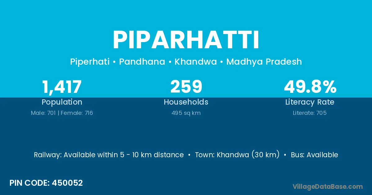 Khandwa (30 km) is the nearest town to Piparhatti village for major economic activities and is located approximately 30 km away.