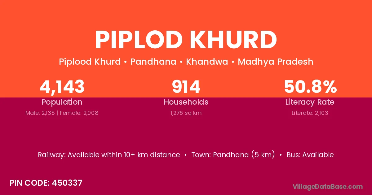 Pandhana (5 km) is the nearest town to Piplod Khurd village for major economic activities and is located approximately 5 km away.