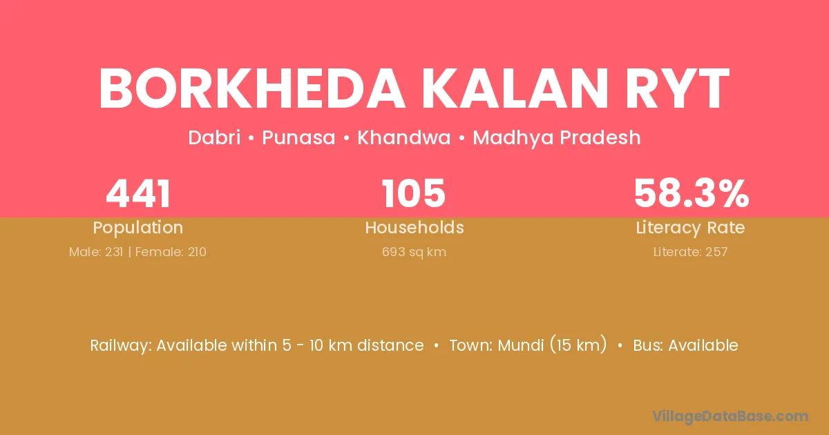 Borkheda Kalan Ryt village has a total population of 441 people, of which 231 are males and 210 are females.