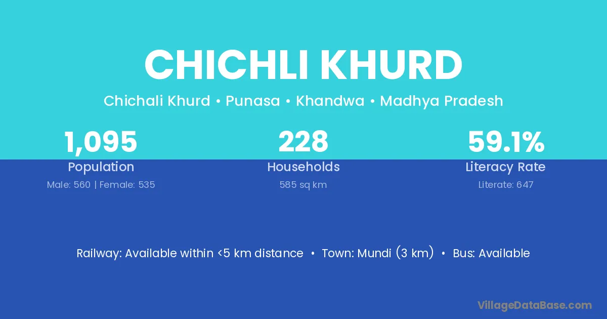 Mundi (3 km) is the nearest town to Chichli Khurd village for major economic activities and is located approximately 3 km away.