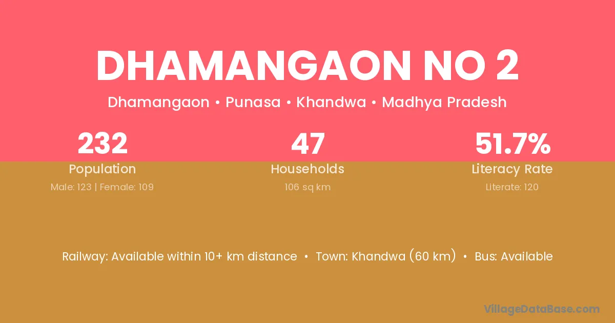 Khandwa (60 km) is the nearest town to Dhamangaon No 2 village for major economic activities and is located approximately 60 km away.