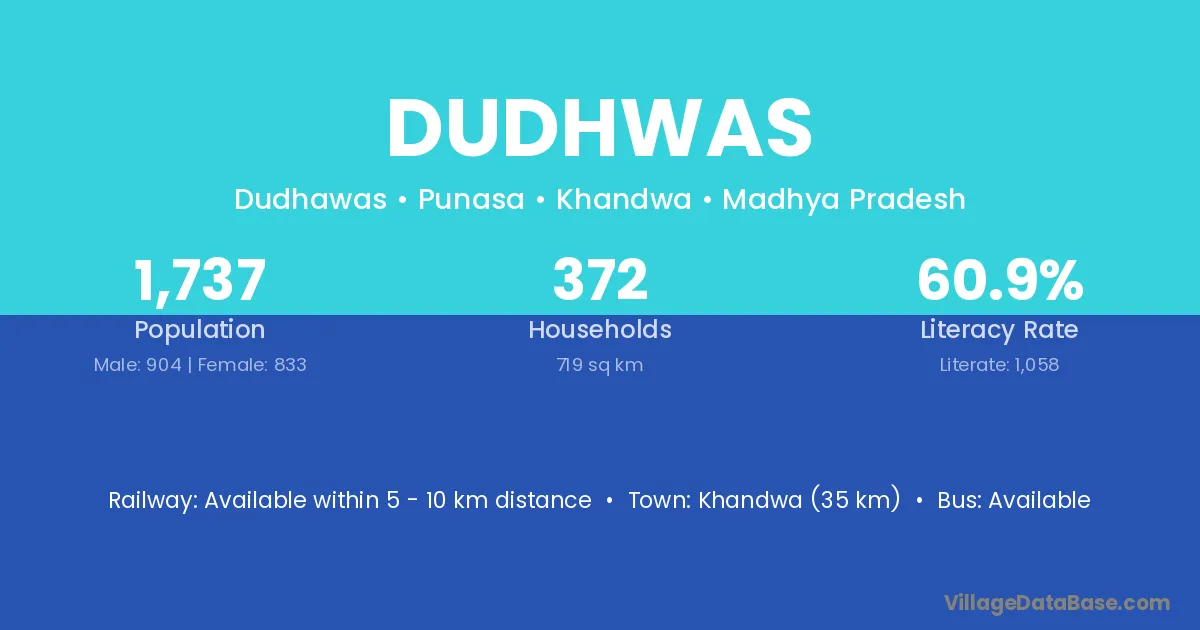Khandwa (35 km) is the nearest town to Dudhwas village for major economic activities and is located approximately 35 km away.