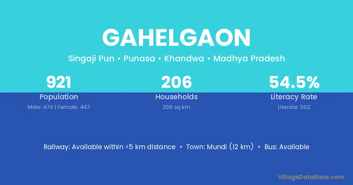 Mundi (12 km) is the nearest town to Gahelgaon village for major economic activities and is located approximately 12 km away.