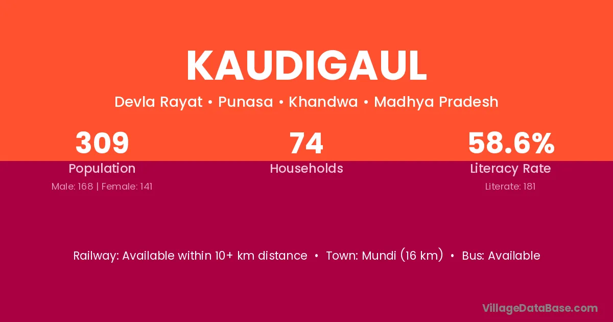 Mundi (16 km) is the nearest town to Kaudigaul village for major economic activities and is located approximately 16 km away.