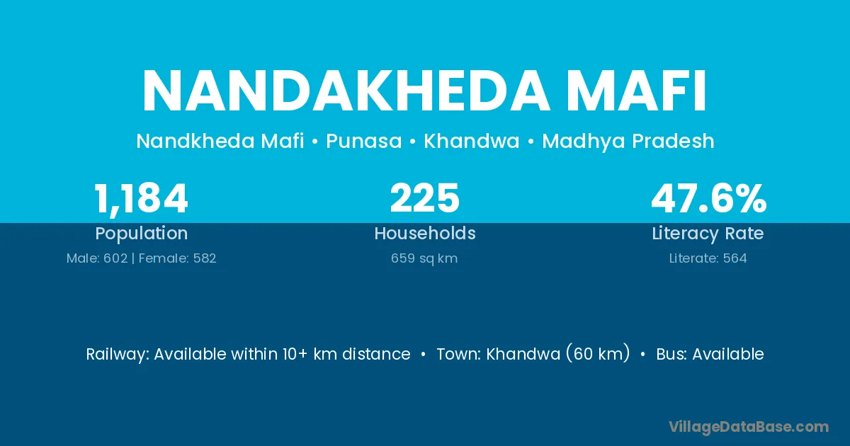 Khandwa (60 km) is the nearest town to Nandakheda Mafi village for major economic activities and is located approximately 60 km away.