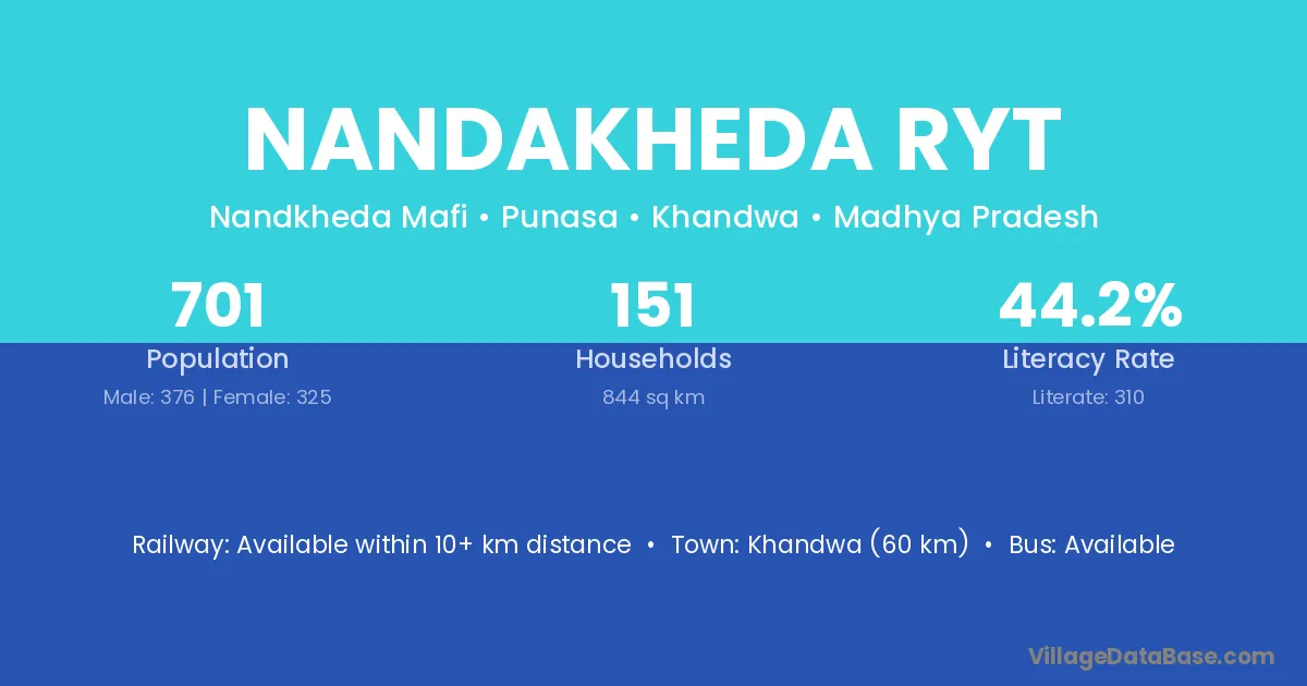 Khandwa (60 km) is the nearest town to Nandakheda Ryt village for major economic activities and is located approximately 60 km away.