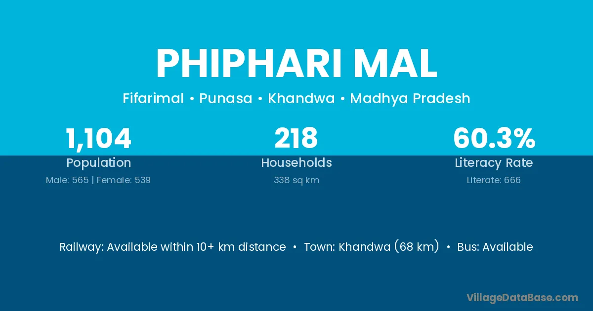 Khandwa (68 km) is the nearest town to Phiphari Mal village for major economic activities and is located approximately 68 km away.