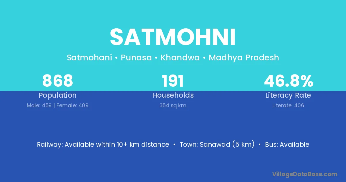 Sanawad (5 km) is the nearest town to Satmohni village for major economic activities and is located approximately 5 km away.