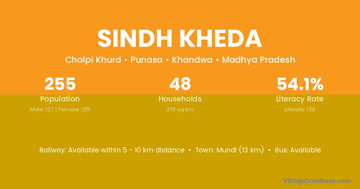 Sindh Kheda village has a total population of 255 people, of which 127 are males and 128 are females.