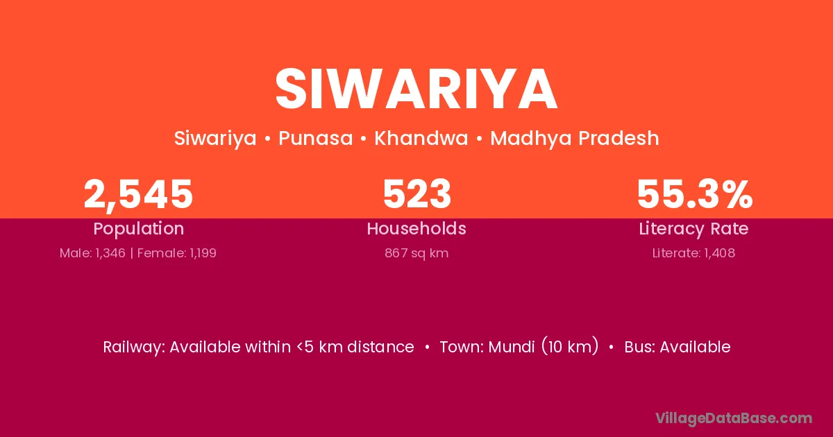 Mundi (10 km) is the nearest town to Siwariya village for major economic activities and is located approximately 10 km away.