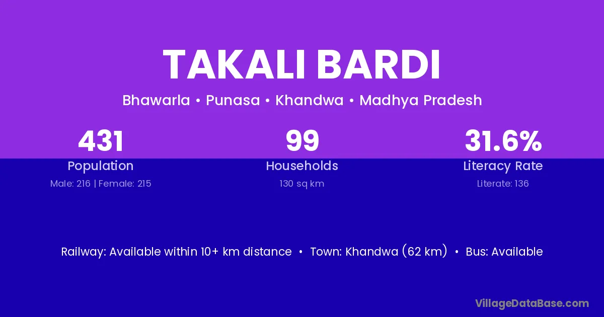 Khandwa (62 km) is the nearest town to Takali Bardi village for major economic activities and is located approximately 62 km away.