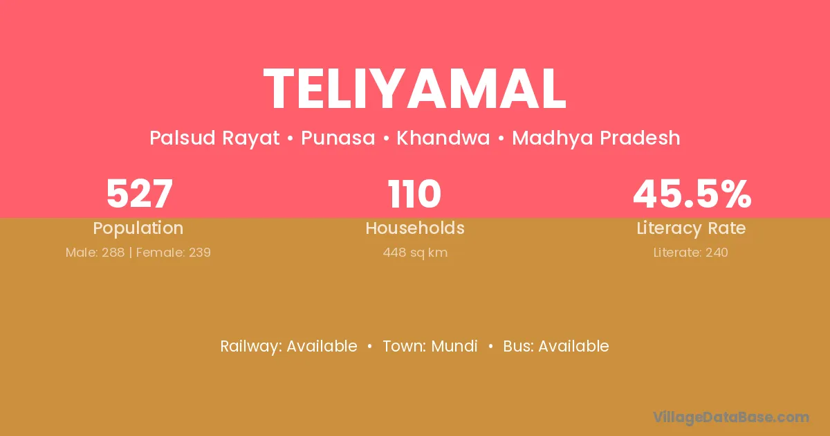 Teliyamal village has a total population of 527 people, of which 288 are males and 239 are females.