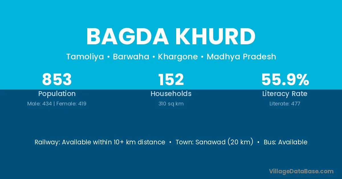 Sanawad (20 km) is the nearest town to Bagda Khurd village for major economic activities and is located approximately 20 km away.