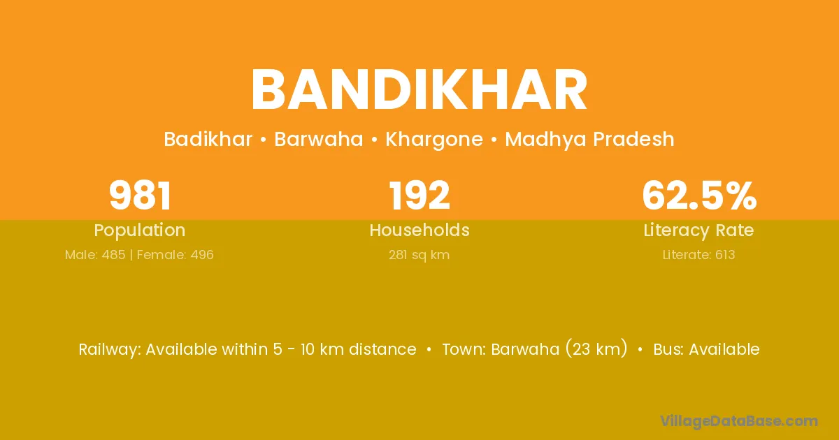 Barwaha (23 km) is the nearest town to Bandikhar village for major economic activities and is located approximately 23 km away.
