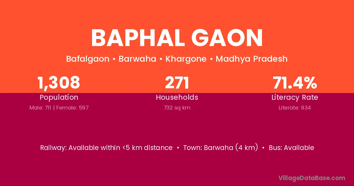 Barwaha (4 km) is the nearest town to Baphal Gaon village for major economic activities and is located approximately 4 km away.